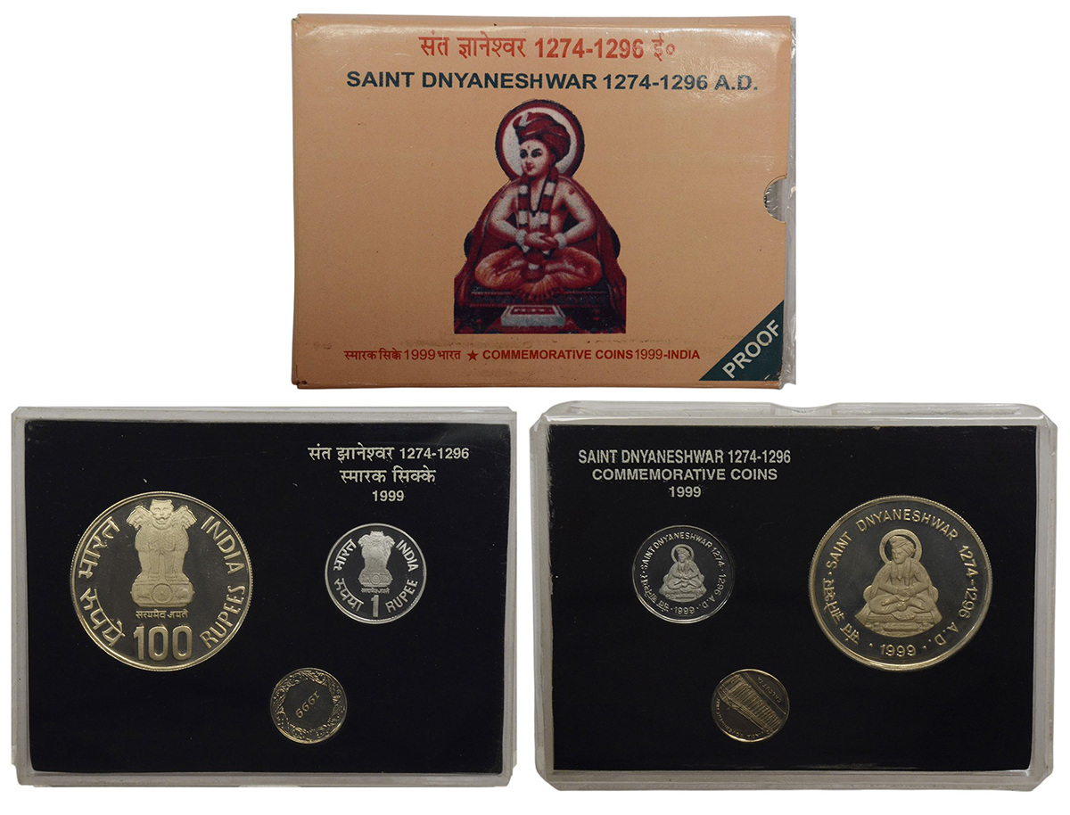 1999, Saint Dnyaneshwar, Proof set of 2 coins, 100 rupees and 1 rupee, Kolkata mint, RB 228, in original mint packing.