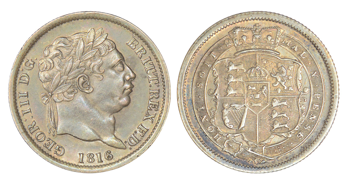 Great Britain, George III, silver shilling, 1816, KM 666, 5.66g. Obv: Laureate head to right. Rev: Crowned arms within order chain.