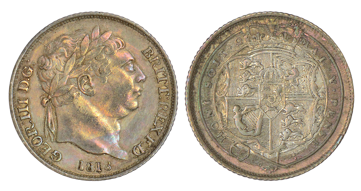 Great Britain, George III, silver 6 pence, 1818, KM 665, 2.81g. Obv: Laureate head to right. Rev: Crowned arms within order chain.