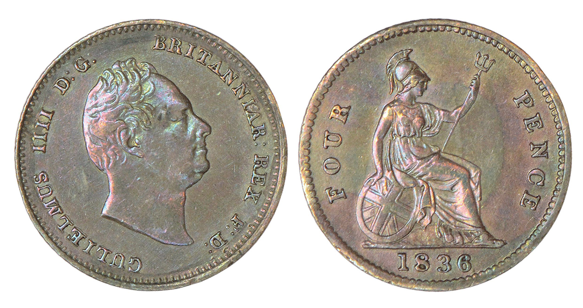 Great Britain, William IV, silver 4 pence (groat), 1836, KM 723, 1.88g. Obv: Head to right. Rev: Britannia seated right; date below.