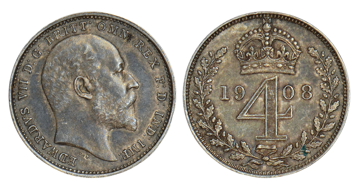 Great Britain, Edward VII, silver 4 pence (groat), 1908, KM 798, 1.88g. Obv: Head to right. Rev: Crowned denomination divides date within wreath.