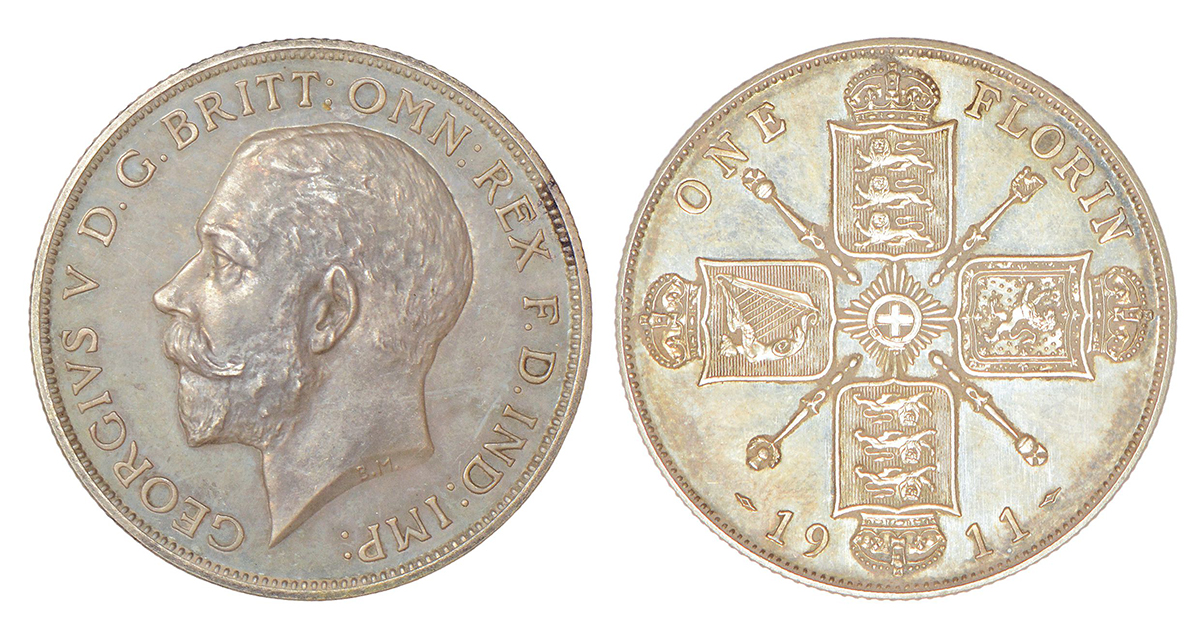 Great Britain, George V, silver florin (2 shillings), 1911, KM 817, 11.26g. Obv: Head to left. Rev: Cross of crowned shield, sceptres in angles.