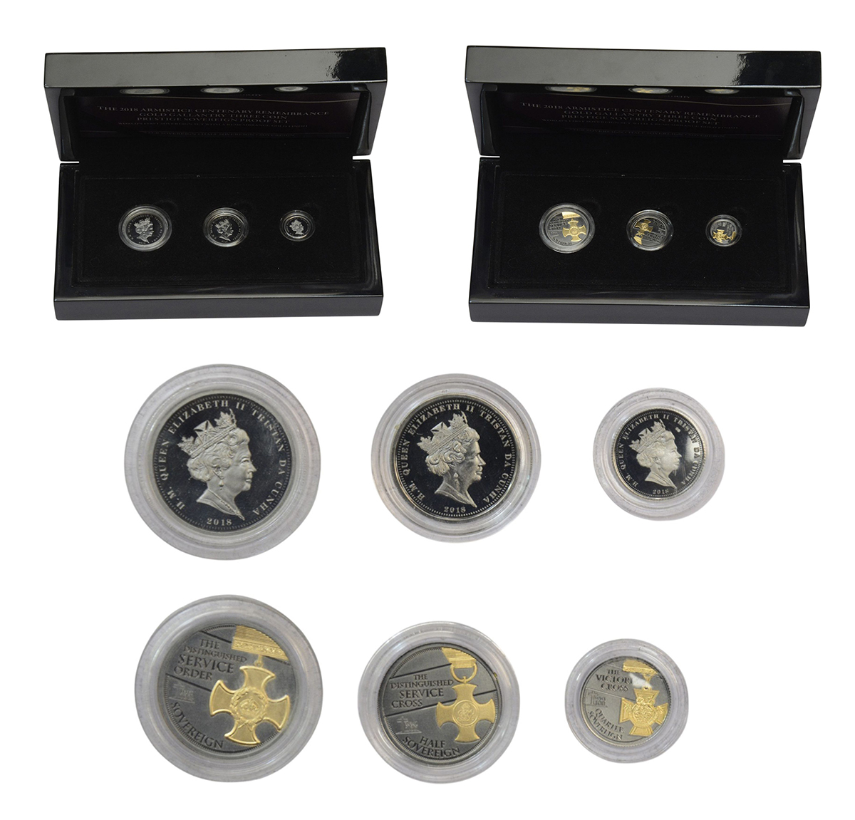 Great Britain, Elizabeth II, Proof set of 3 gold coins, 2018, includes sovereign, 8g; ½ sovereign, 4g and ¼ sovereign, 2g; struck to celebrate Centenary of the Armistice. Obv: Portrait of Queen Elizabeth II. Rev: Depiction of the Distinguished Service Order medal.