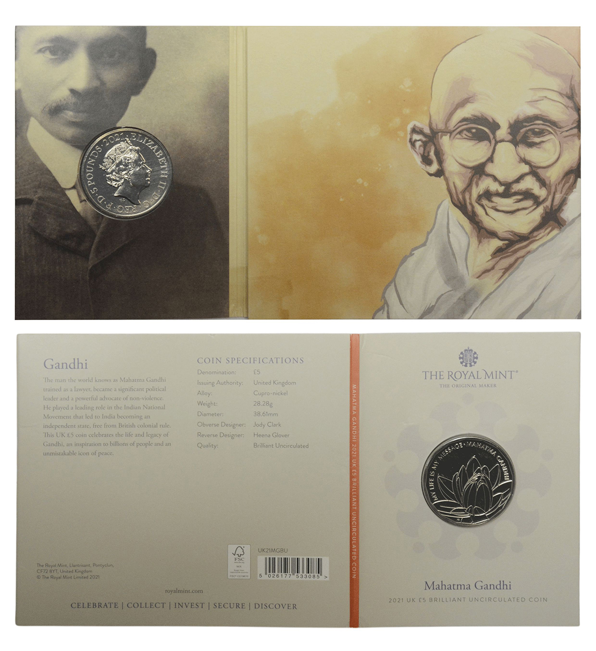 Great Britain, Elizabeth II, Brilliant Uncirculated cupro-nickel 5 pound, struck by Royal mint, this coin celebrates the life and legacy of Mahatma Gandhi, 28.28g.
