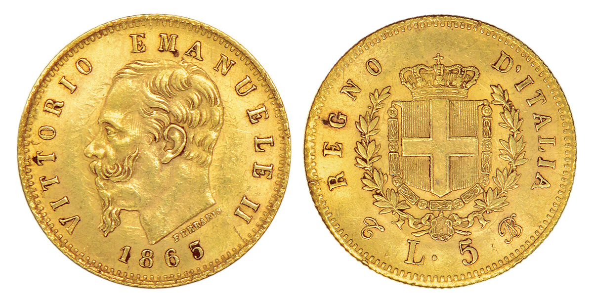 Italy, Vittorio Emanuele II, gold 5 lire, 1865, 'T/BN' mint mark, KM 17, 1.60g. Obv: Portrait bust of king. Rev: Crowned shield within wreath.