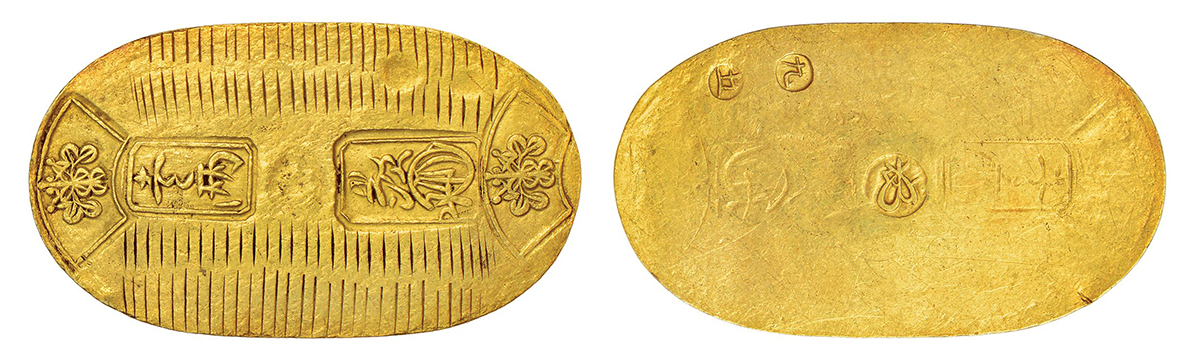 Japan, Manen Era, gold koban, ND (1861-1867), Edo (Tokyo) mint, 3.34g. Obv: Fan-shaped fileds hold pawlonia crests, vertical rectangles hold two and one characters on lined filed. Rev: Central butterfly like character, two-minute banker's marks.