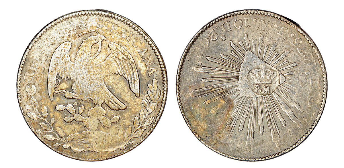 Mexico, Federal Republic, silver 8 reales, 1875, 26.95g. Obv: Facing eagle, snake in beak; legend around. Rev: Crowned PM countermark (for Port Mozambique) on radiant cap.