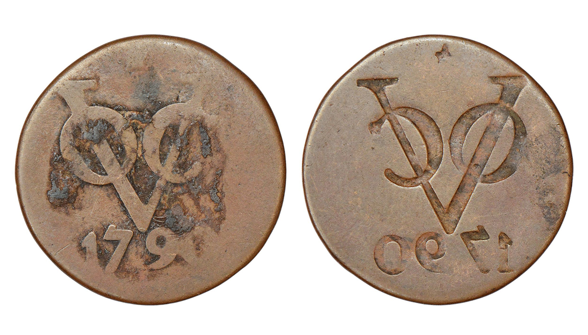 Netherlands East Indies, copper 2 duit, 1790, obverse part brockage (lakhi) on reverse, 5.47g.