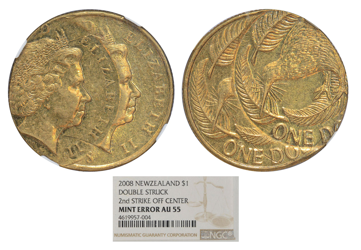 New Zealand, Elizabeth II, error, aluminium bronze 2 dollars, traces of triple struck on both sides...