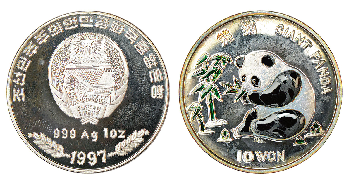 North Korea, silver 10 won, 1997, KM 138.1, 30.96g. Sub: Giant Panda. Obv: Seated panda eating bamboo. Rev: National arms.