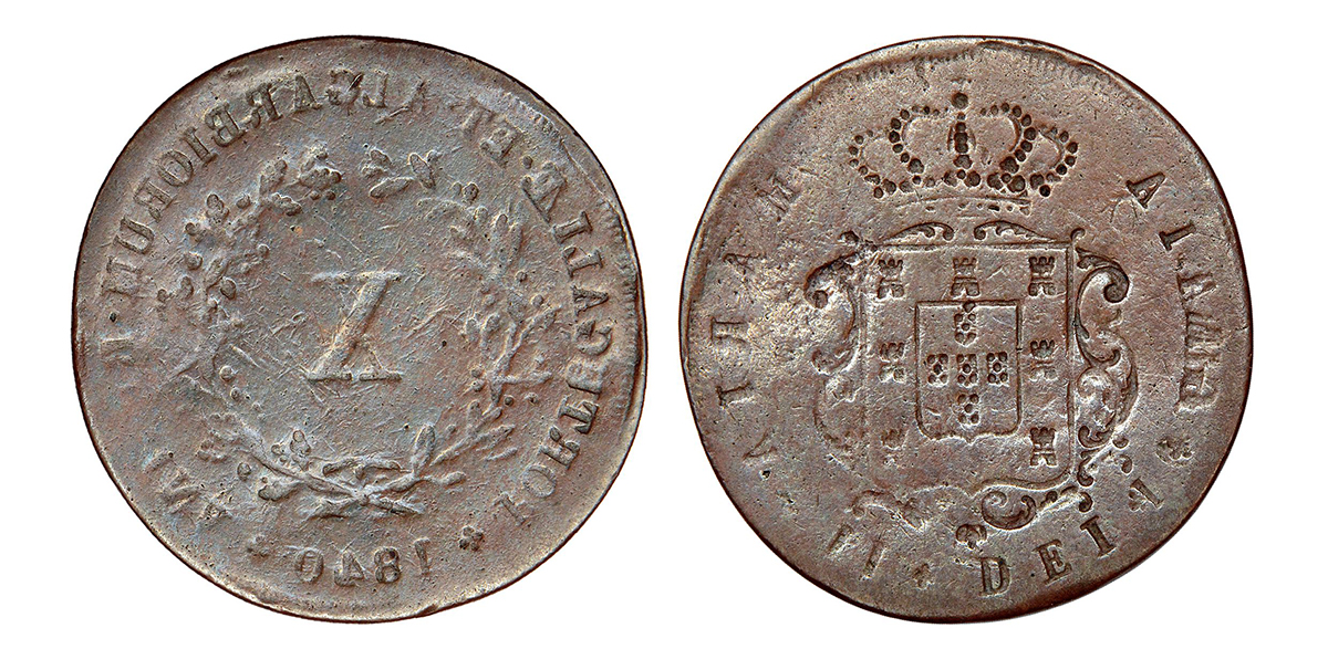 Portugal, Maria II (1834-1853 AD), copper 10 reis, 1840, flipover error, KM 481, 7.91g. Retrograde on both sides where the obverse and reverse are mirrored (reversed).