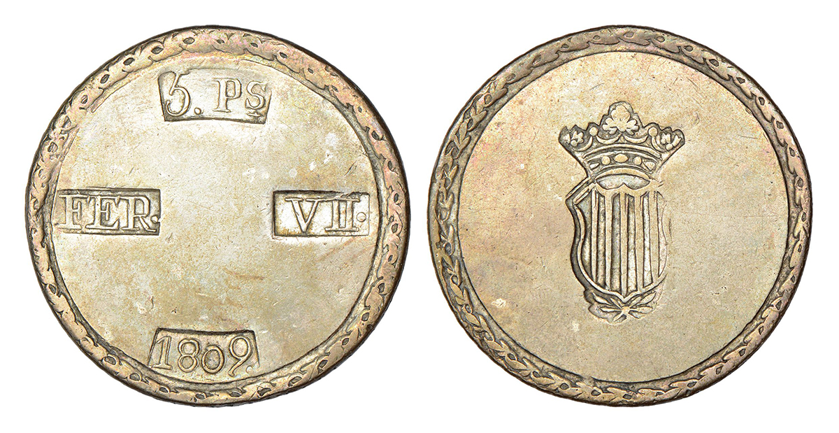 Spain, Lerida Province, Ferdinand VII, silver 5 pesetas, 1809, KM 10, 26.31g. Obv: 5 PS / FER VII / 1809 in counterstamps. Rev: Crowned shields.