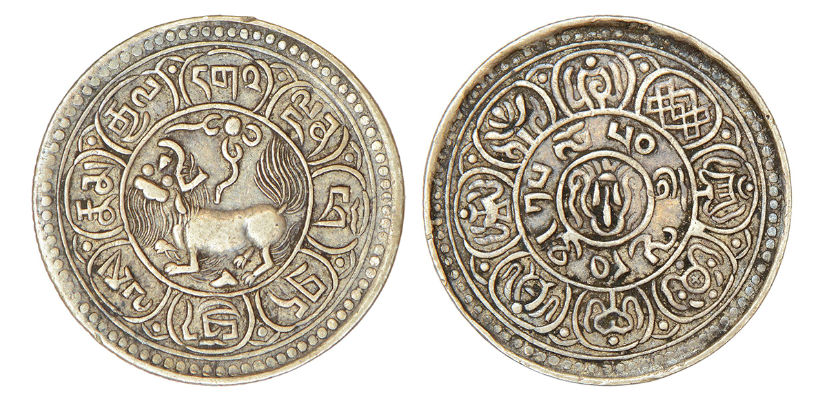 Tibet, silver Theocracy 5 sho, BE 15-50 (1916), Dode mint, KM Y18, 8.03g. Obv: Snow lion facing left with scroll ornaments around, surrounded by Tibetan characters. Rev: Triratna surrounded by Tibetan characters, all surrounded by the Buddhist Eight Auspicious symbols.