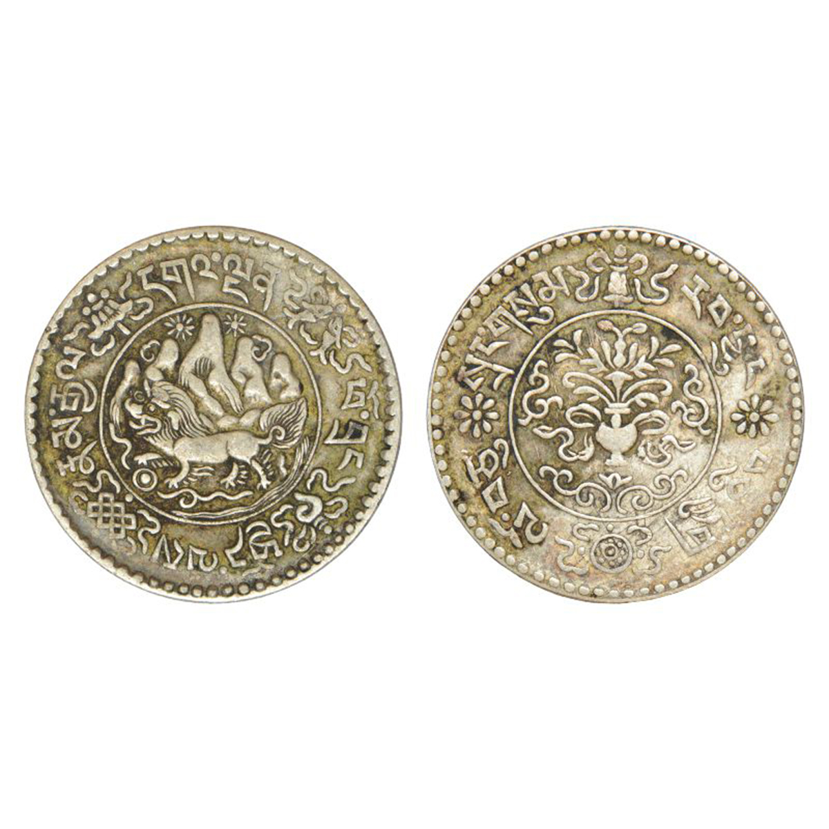 Tibet, silver 3 srang, KM Y26, 12.05g. Obv: Snow lion facing in front of mount Kailash with two suns in the background. Rev: Treasure vase (a Buddhist auspicious symbol), containing foliage with scroll ornaments.