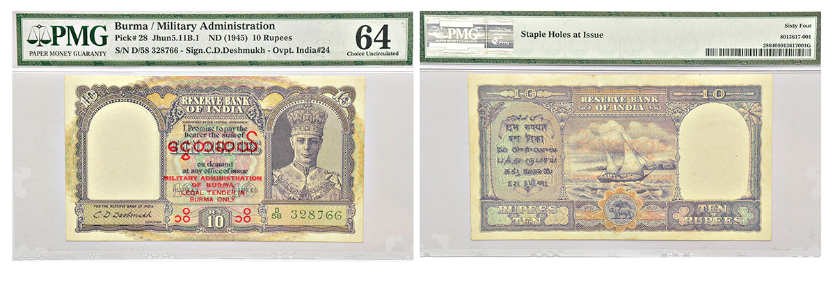 Burma, George VI, 10 rupees, ND (1945), signed by C.D. Deshmukh, serial no.: D58 328766 in green, Burmese legend in centre reads ngwet'set (silver coins ten) and Military Administration/of Burma/Legal Tender in/Burma Only in five lines in red overprint, J&R 5.11B.1.