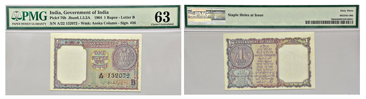 1 rupee, 1964, signed by S. Bhoothalingam, inset 'B', serial no.: A22 132072, J&R 6.1.5.2A.