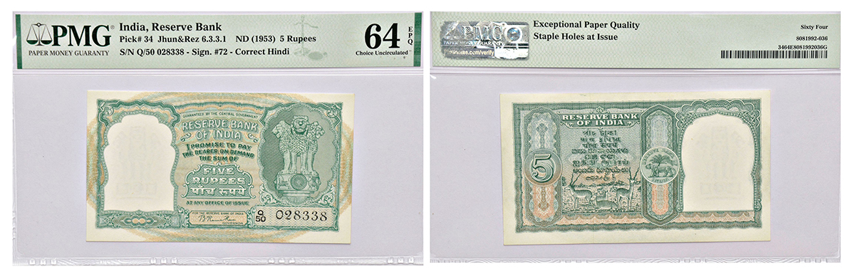 5 rupees, Black Buck series, ND (1953), signed by B. Rama Rau, corrected रुपये in Hindi, without inset, serial no.: Q50 028338, J&R 6.3.3.1.