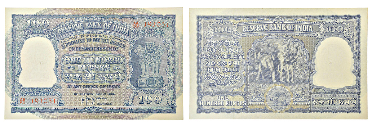 100 rupees, Elephant series, ND (1951), signed by B. Rama Rau, incorrect रूपया in Hindi, serial no....