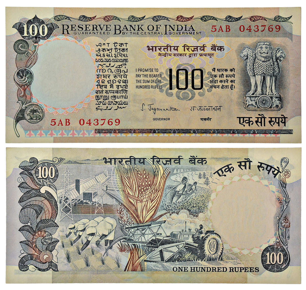 100 rupees, Agriculture series, ND (1975), signed by S. Jagannathan, without inset, serial no.: 5AB 043769, J&R 6.7.8.1.