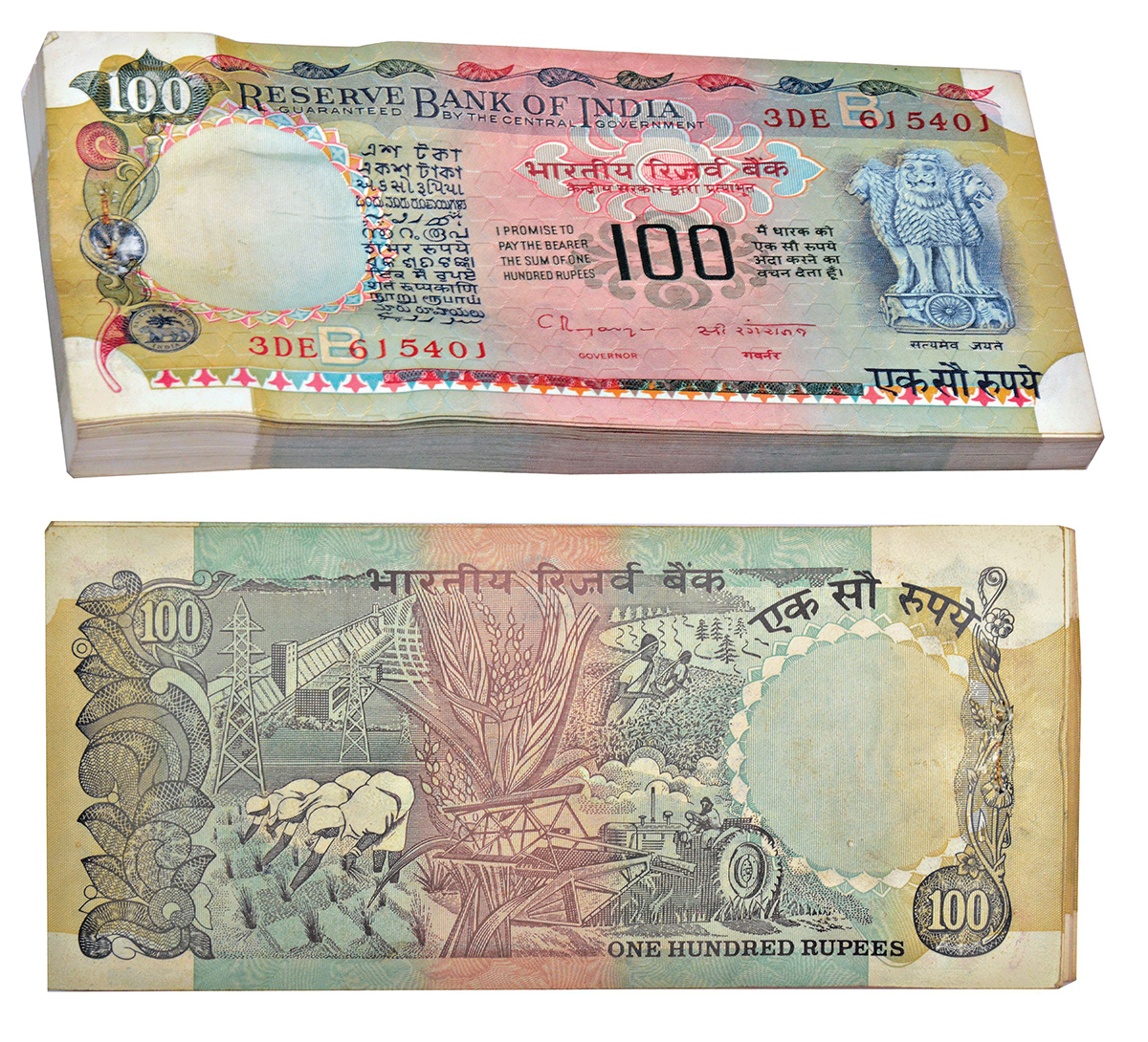 100 rupees, full packet of 100 notes, Agriculture series, ND (1992-1997), signed by C. Rangarajan, inset 'B', serial nos.: 3DE 615401 to 615500, J&R 6.7.10.5C. (100 notes)