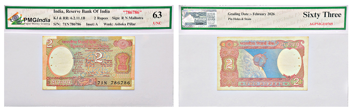 2 rupees, fancy number note, Aryabhatta series, signed by R.N. Malhotra, inset 'A', serial no.: 71N 786786, J&R 6.2.11.1B.