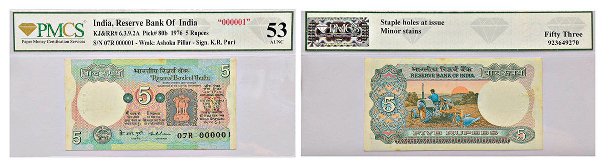 5 rupees, fancy number note, Tractor series, ND (1976), signed by K.R. Puri, without inset, serial no.: 07R 000001, J&R 6.3.9.2A.