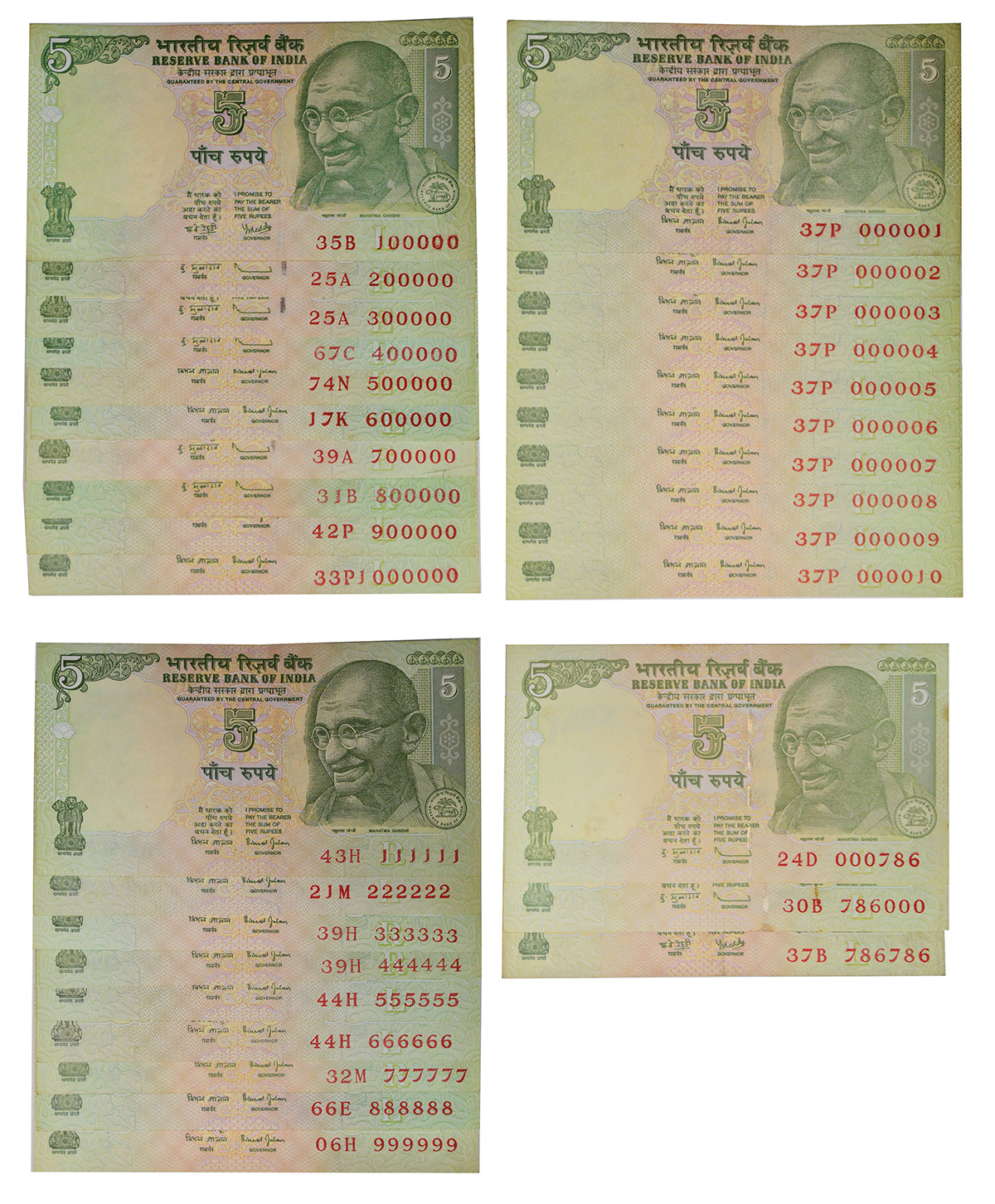 5 rupees, set of 32 fancy number notes, Gandhi series, various Governor's signature, with and without inset, serial nos.: 000001 to 000010, 100000 to 1000000, 111111 to 999999, 000786, 786000 and 786786. (32 notes)