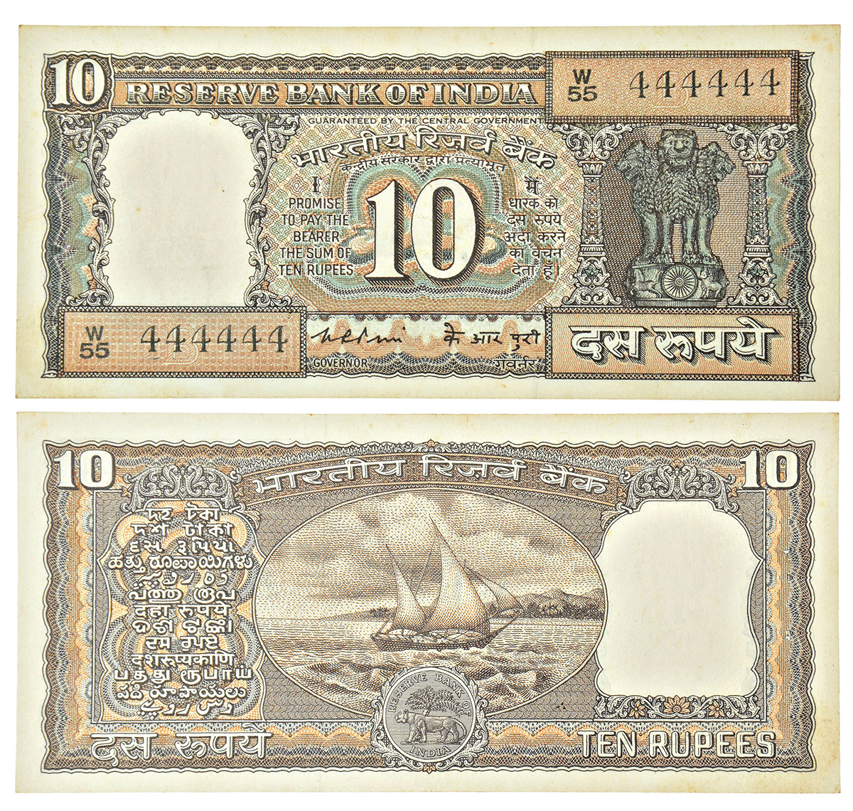 10 rupees, fancy number note, Boat series, signed by K.R. Puri, inset 'B', serial no.: W55 444444, J&R 6.4.8.2.