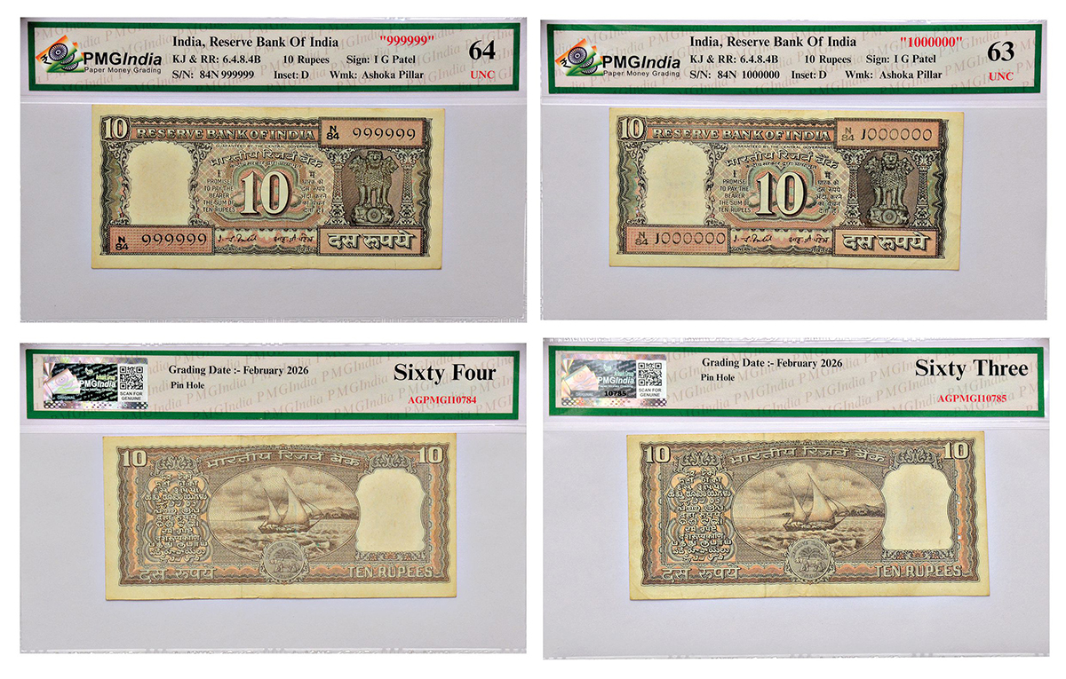 10 rupees, fancy number notes pair (2), Boat series, signed by I.G. Patel, inset 'D', serial nos.: N84 999999 and 1000000, J&R 6.4.8.4B. (2 notes)