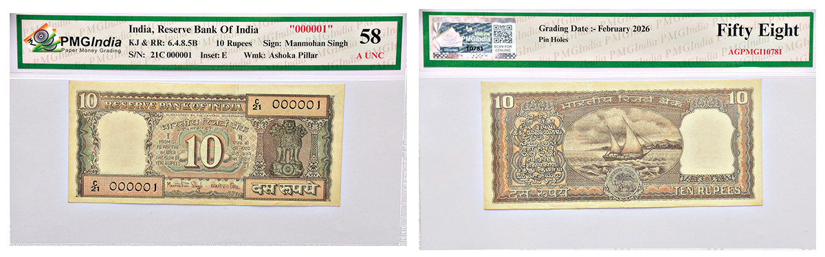 10 rupees, fancy number note, Boat series, signed by Manmohan Singh, inset 'E', serial no.: C21 000001, J&R 6.4.8.5B.