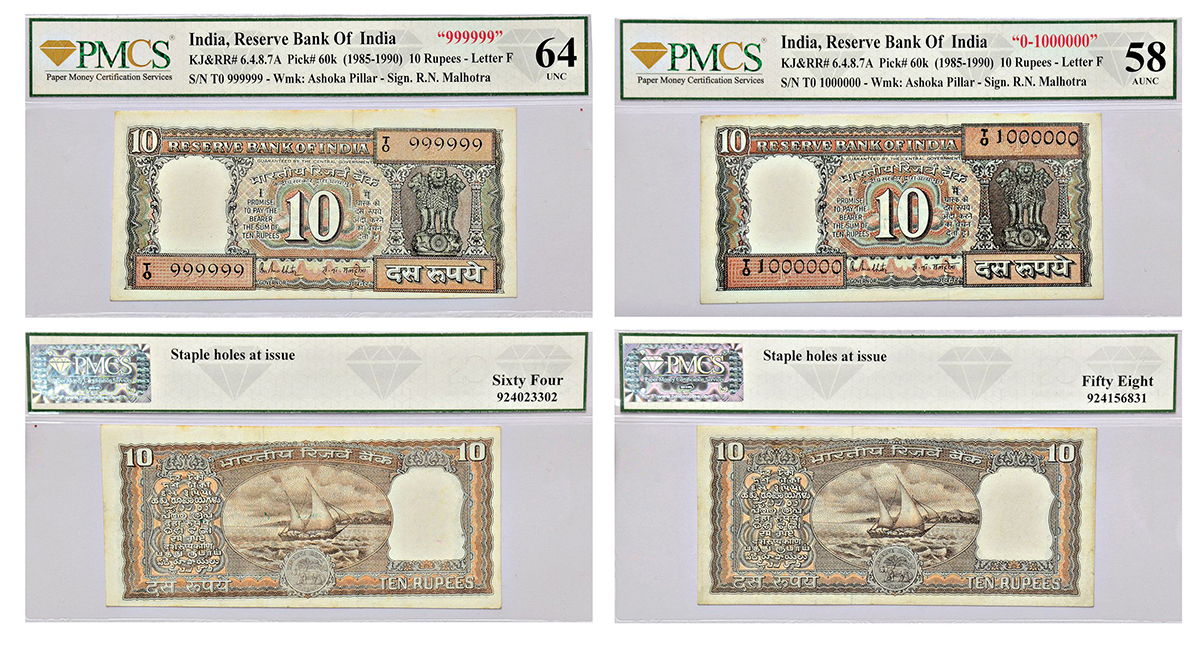 10 rupees, fancy number notes pair (2), Boat series, ND (1985-90), signed by R.N. Malhotra, inset 'F', serial no.: T0 999999 and 1000000, J&R 6.4.8.7A. (2 coins)