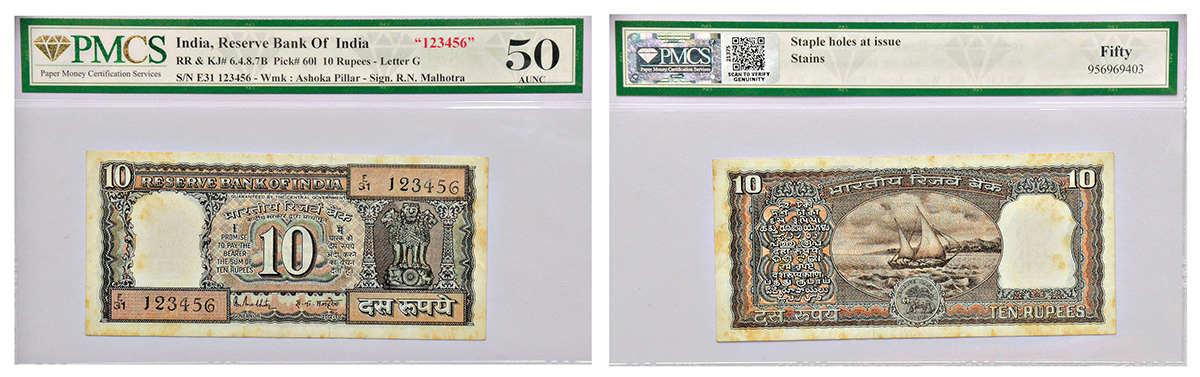 10 rupees, fancy number note, Boat series, ND (1985-90), signed by R.N. Malhotra, inset 'G', serial no.: E31 123456, J&R 6.4.8.7B.