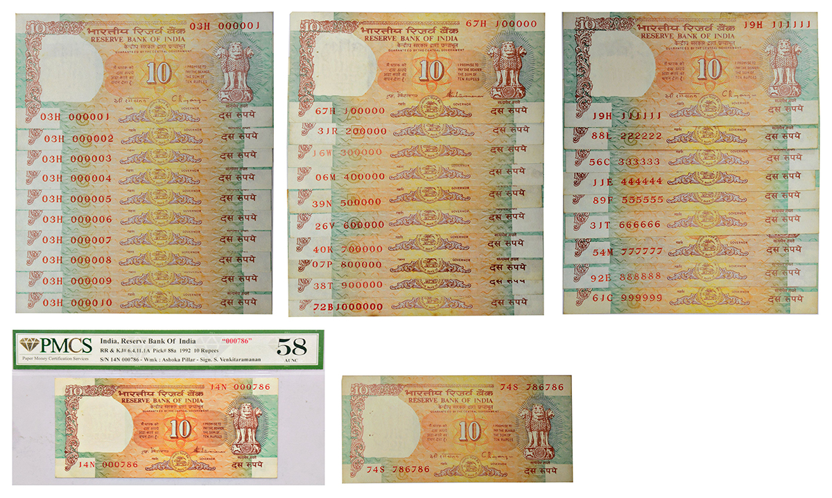 10 rupees, set of 31 fancy number notes (786000 missing from set of 32 notes), Shalimar Garden series, various Governor's signature, with and without inset, serial nos.: 000001 to 000010, 100000 to 1000000, 111111 to 999999, 000786 and 786786. (31 notes)