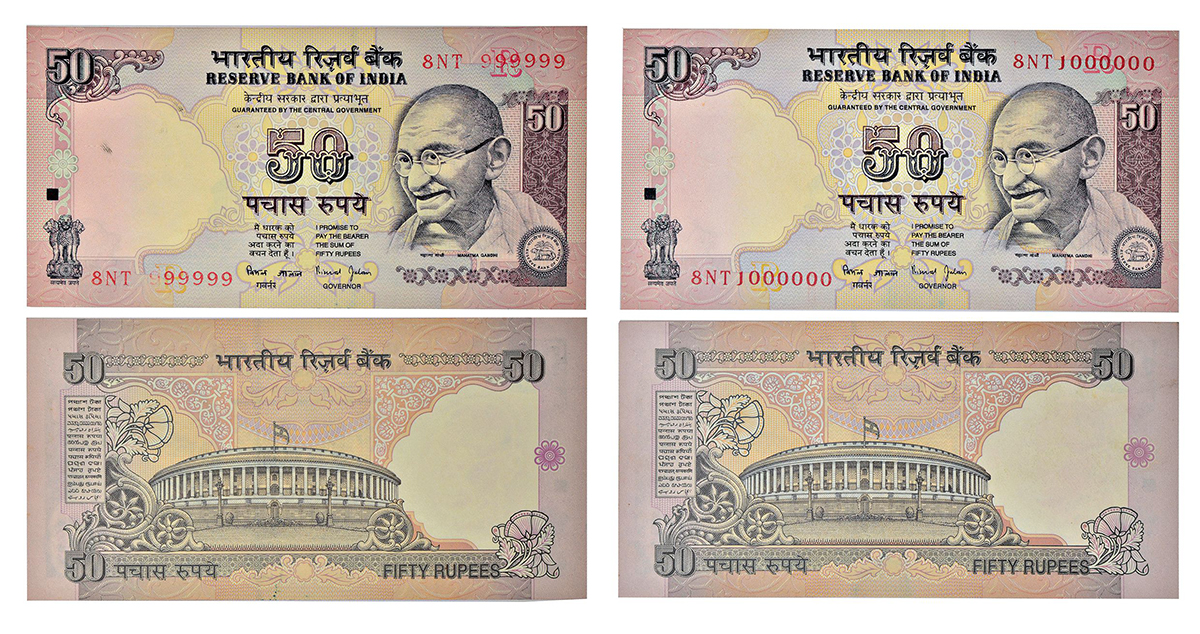 50 rupees, fancy number notes pair (2), Gandhi series, signed by Bimal Jalan, inset 'R', serial nos.: 8NT 999999 and 1000000. (2 notes)