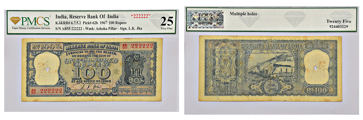 100 rupees, fancy number note, Diamond series, ND (1967), signed by L.K. Jha, serial no.: AB55 222222, J&R 6.7.5.2.
