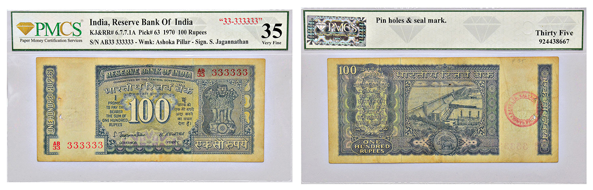 100 rupees, fancy number note, Hirakud Dam series, ND (1970), signed by S. Jagannathan, serial no.: AB33 333333 (super fancy), J&R 6.7.7.1A.