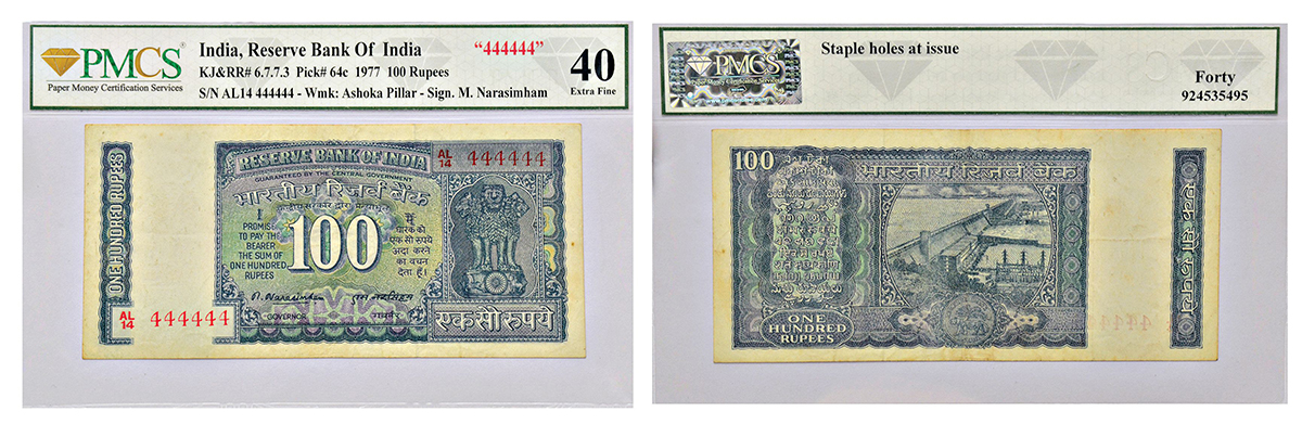 100 rupees, fancy number note, Hirakud Dam series, ND (1977), signed by M. Narasimham, serial no.: AL14 444444, J&R 6.7.7.3.