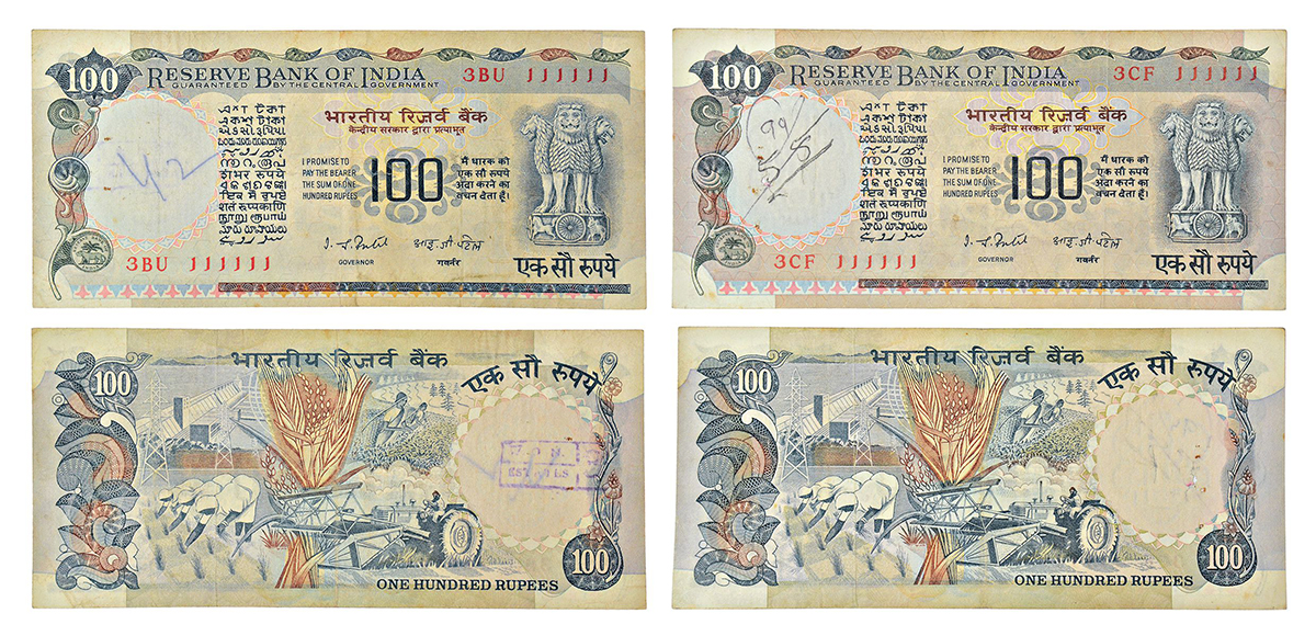 100 rupees, fancy number notes (2), Agriculture series, signed by I.G. Patel, without inset, serial nos.: 3BU 111111 and 3CF 111111, J&R 6.7.8.4. (2 notes)