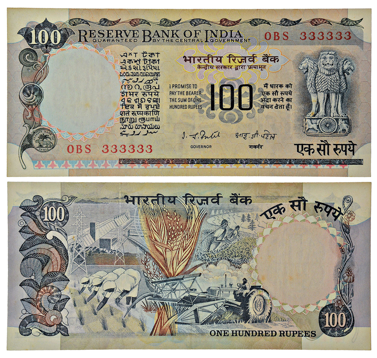 100 rupees, fancy number note, Agriculture series, signed by I.G. Patel, without inset, serial no.: 0BS 333333, J&R 6.7.8.4.