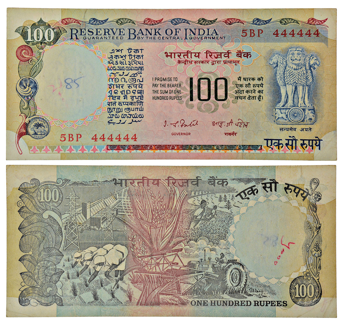 100 rupees, fancy number note, Agriculture series, signed by I.G. Patel, without inset, serial no.: 5BP 444444, J&R 6.7.8.4.