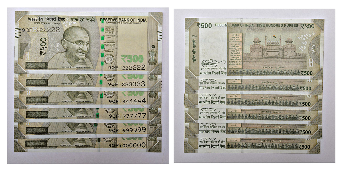 500 rupees, set of 6 fancy number notes, new Gandhi series, 2024, signed by Shaktikanta Das, inset 'B', telescopic serial nos.: 9QF 222222, 333333, 444444, 777777, 999999 and 1000000 (1 million). (6 notes)