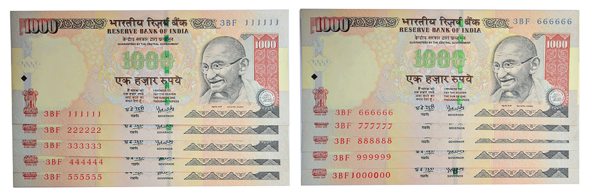 1000 rupees, set of 10 fancy number notes, Gandhi series, 2007, all notes are signed by Y.V. Reddy, without inset, serial no.: 3BF 111111 to 1000000 (same prefix). (10 notes)