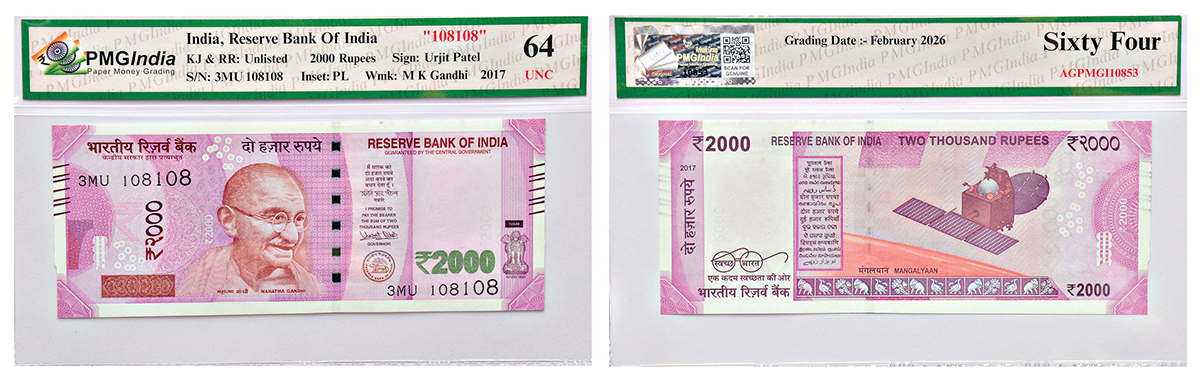 2000 rupees, semi-fancy number note, new Gandhi series, 2017, signed by Urjit Patel, without inset, telescopic serial no.: 3MU 108108.