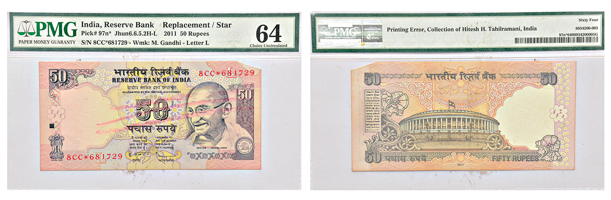 50 rupees, star and misprint note, Gandhi series, 2011, signed by D. Subbarao, inset 'L', serial no.: 8CC*681729, printing error.