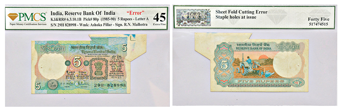 5 rupees, misprint note, Tractor series, ND (1985-90), signed by R.N. Malhotra, inset 'A', serial no.: 29H 828998, sheet fold cutting error.