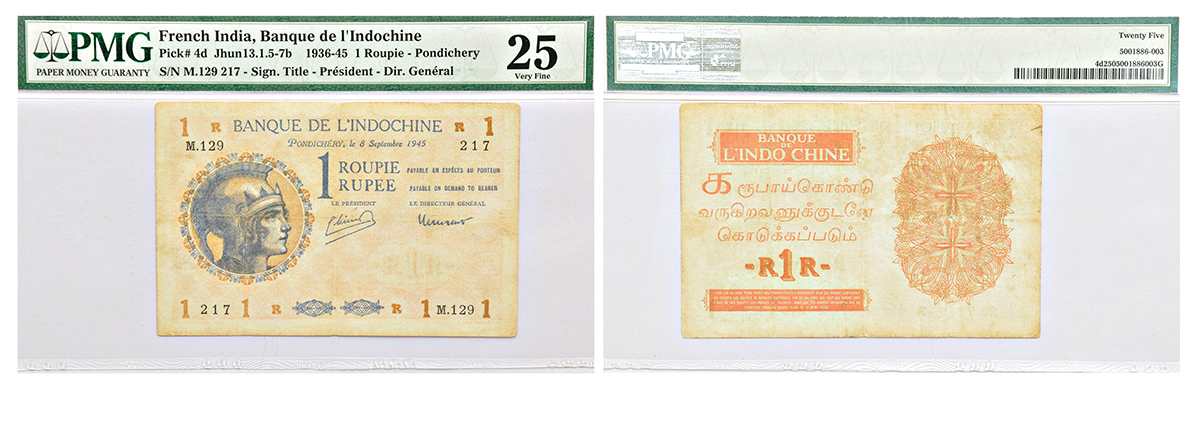 Indo-French Territories, 1 roupie, dated 8th September 1945, signed by Emile Minost as President and Jean Laurent as Director-General, with 2 crosses in Guilloche on reverse, serial no.: 217, J&R 13.1.7a.