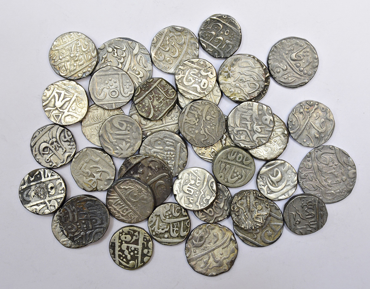 A group of 39 mostly Princely States silver rupee, includes Alwar, Awadh, Bhopal, Bundi, Gwalior, Jammu-Kashmir, Jodhpur, Kota, Maratha, Mysore, Pratapgarh, Tonk, Wanparti and some others, various rulers, dates and types. (39 coins)
