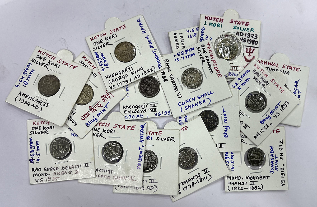 A group of 15 Princely States silver coins, includes 1x Kutch kori; 1x Kutch ½ kori; 3x Jamnagar ko...