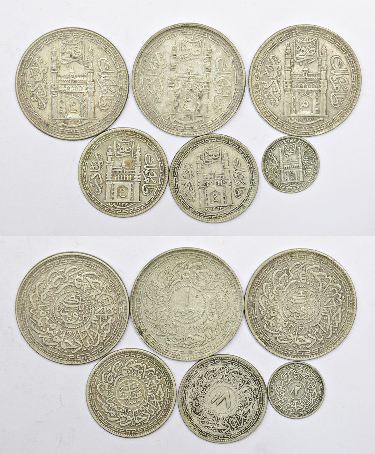 A group of 6 Hyderabad state silver coins, includes, 3x rupee, 2x ½ rupee and 1x ⅛ rupee, various dates and types. (6 coins)