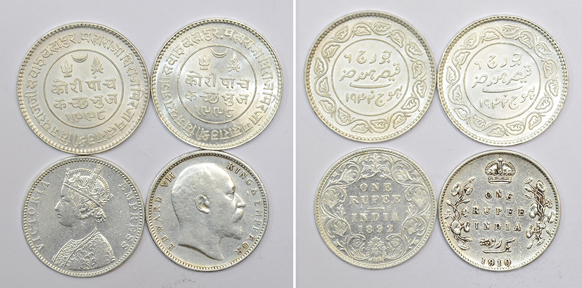 A group of 4 silver coins, includes 2x 5 kori of Kutch's Vijayrajji and 2x rupee of Victoria Empress and Edward VII, various rulers, dates and types. (4 coins)